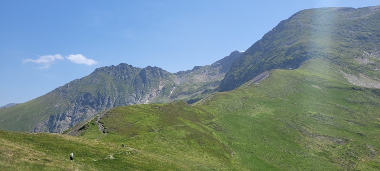 From the village of Fos and the Comminges, after a long climb and crossing the Col d'Auéran, at 2176m altitude, you leave the Haute Garonne for the Ariège and the Couserans. From the pass, you can see the beautiful site of the Araing refuge, the finish line of the stage, located near the pond of the same name beneath the cliffs of the Crabère summit. The landscapes we've crossed are a harbinger of the wilderness of this Pyrenean region.