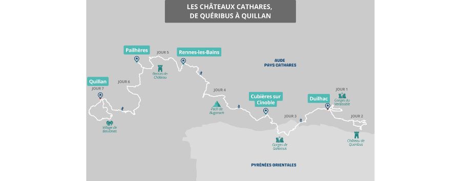 Au départ du nid d'aigle de Quéribus, cette randonnée vous conduira jusqu'à Quillan, à travers un territoire tourmenté et chargé d'histoire, où vous découvrirez des richesses insoupçonnées ou typiques, d'un point de vue gastronomique, culturel, ou encore artisanal.