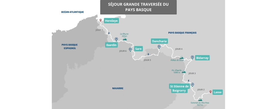 Cette Grande Traversée du Pays Basque, qui vous mènera des montagnes à l'Océan Atlantique, emprunte en partie le fameux itinéraire du GR10, la grande Traversée des Pyrénées (866km de l'Atlantique à la Méditerranée). Elle vous permettra de découvrir les doubles facettes du Pays Basque : un territoire sauvage et habité, une terre de cultures et de traditions partagée entre deux pays, le vert des montagnes et le bleu de l'Océan.