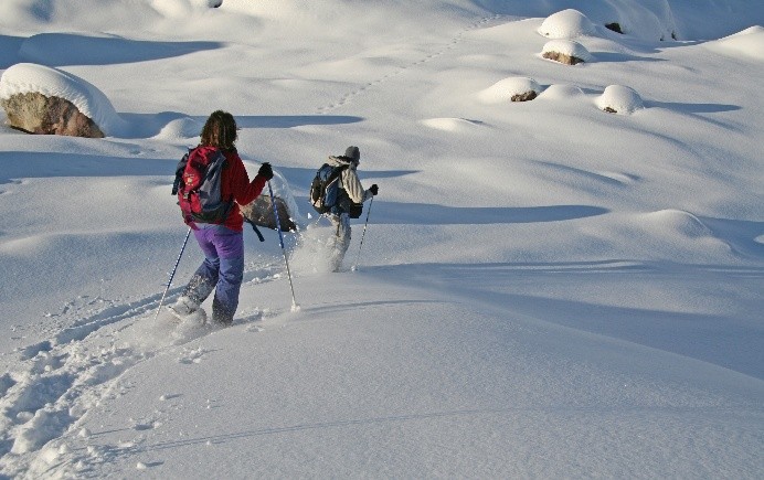 Randonnées en montagne enneigée, sur des reliefs doux adaptés à la pratique des raquettes à neige. Les conditions de neige évoluent en permanence : dure ou molle, profonde ou stable, rapide ou collante. Ce paramètre imprévisible fait partie prenante de votre séjour et peut modifier votre aisance.