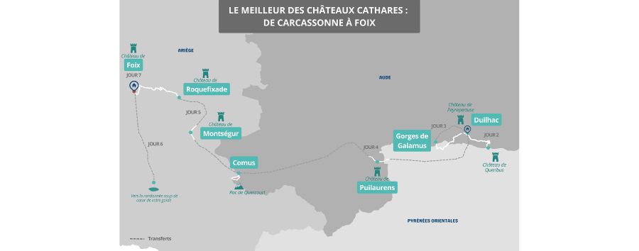 Au départ de Carcassonne et sa célèbre cité médiévale, vous partirez à la découverte des sites et châteaux les plus célèbres de l'histoire Cathare, au coeur de paysages aussi époustouflants que variés, que votre guide aura plaisir à vous faire découvrir. Dans le département de l'Aude tout d'abord, vous aurez l'occasion de visiter le nid d'aigle de Quéribus, l'incroyable forteresse de Peyrepertuse, Puilaurens, bastion par excellence.