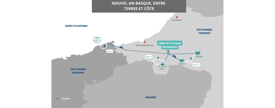 Un réveillon inédit entre terres et côte basque ! Au cours de nos balades, nous aurons le loisir de randonner sur le littoral basque espagnol, de découvrir le massif de la Rhune, figure de proue des Pyrénées, ou encore de découvrir, à pied, deux des villages classés les plus fameux du Pays Basque : Espelette et Ainhoa.