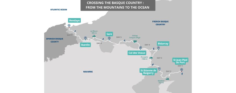 From Saint-Jean-Pied-de-Port, the historic capital of the Basque Country, you will walk towards Saint Etienne de Baïrorri, with the sumptuous Iparla crest in the background, and then towards Bidarray. From rolling hills to small peaks, you will then cross villages with magical names, such as Ainhoa, Sare, Dancharia, with bright and shimmering tones, built in the purest Basque tradition. You will taste the Spanish atmosphere when reaching the border at the Col d'Ibardin, before descending towards Hendaye, to enjoy the charms of this lively coastal town bordered by the superb bay of Txingudi.