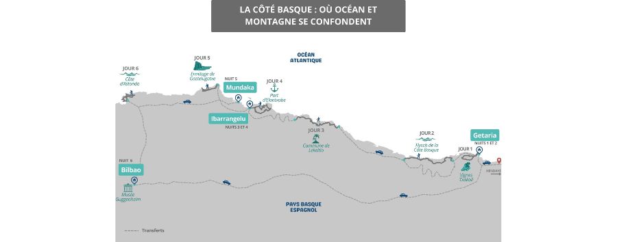La gastronomie ne sera pas en reste sur ce territoire riche d'un patrimoine culturel et culinaire exceptionnel. Chaque soir, des spécialités culinaires basques vous attendent : tapas, Txakoli, poissons… Enfin, la touche culturelle, avec la découverte du célèbre Musée GUGGENHEIM, ainsi que du superbe ermitage de Gaztelugatxe, une belle surprise en perspective !