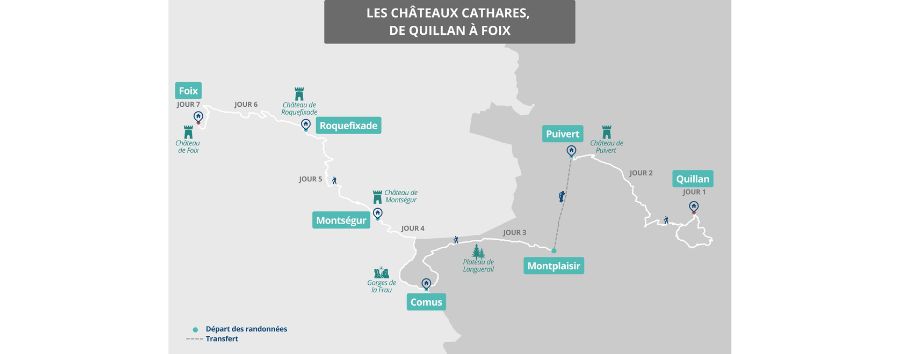 Entre l'Aude et l'Ariège, au coeur du piémont Pyrénéen se dressent d'imposantes citadelles de pierres, les châteaux cathares. Ces forteresses demeurent la mémoire vivante d'une histoire tragique qui marqua le Sud-Ouest de la France, lors de la Croisade des Albigeois. Au départ de Quillan, cet itinéraire vous conduira jusqu'à Foix, au coeur d'un territoire tourmenté et chargé d'histoire. Dans le département de l'Aude tout d'abord, vous aurez l'occasion de visiter Puivert et son château, sur la terre des Troubadours. Depuis Comus et le Pays de Sault, vous rejoindrez l'Ariège et le château de Montségur, le plus haut des châteaux cathares, dressé sur son « pog » à 1207m d'altitude. Puis, avant de rejoindre la cité de Foix et son château, vous irez rendre visite au proche voisin de Montségur, Roquefixade juché au sommet d'une impressionnante falaise.
