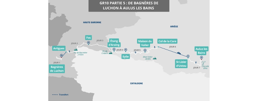 L'itinéraire de cette 5ème partie de la traversée des Pyrénées dont le célèbre GR® 10 est le fil rouge quitte progressivement les Pyrénées Centrales pour les Pyrénées Ariégeoise et la région très sauvage du Couserans.
