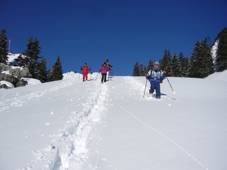 Randonnées en montagne enneigée, sur des reliefs doux adaptés à la pratique des raquettes à neige.