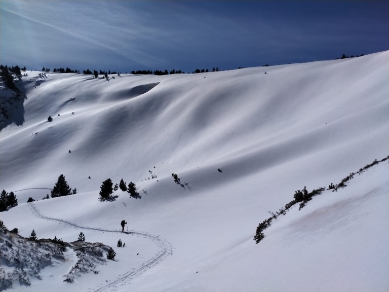 Ce massif, resté sauvage et à l’écart des stations de ski, offre ses doux reliefs et sa forêt à nos pas de randonneurs hivernaux. Les traces d’animaux sont nombreuses et nous invitent à les suivre au coeur de ce massif aux allures de grand Nord !